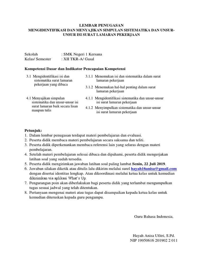 Materi surat lamaran kerja : Surat lamaran pekerjaan adalah surat dari seseorang yang memerlukan pekerjaan kepada orang atau pejabat yang dapat memberikan pekerjaan atau jabatan. Bahasa yang digunakan dalam surat lamaran pekerjaan haruslah sopan dan formal untuk menunjukkan keseriusan kita dalam melamar pekerjaan. Paragraf pembuka isi surat paragraf penutup salam penutup tanda tangan dan nama lengkap. Peserta didik diminta untuk membandingkan unsur kebahasaan surat lamaran pekerjaan. Berikut penjelasan mengenai unsur surat lamaran pekerjaan Demikian surat lamaran pekerjaan ini saya buat. Nama lengkap, usia, posisi pekerjaan yang hendak dilamar, keterampilan, dan. Di dalam surat lamaran kerja, ada beberapa unsur yang harus dicantumkan seperti. 2 minggu x 4 jam pelajaran @45 menit. Surat lamaran pekerjaan biasanya bersifat resmi atau formal dari seseorang yang membutuhkan pekerjaan, contohnya surat lamaran kepada bank bri untuk menjadi karyawan bank tersebut. Demikian surat lamaran pekerjaan ini saya buat. Unsur kebahasaan surat lamaran pekerjaan for later.